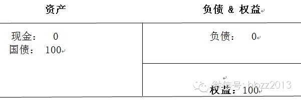 如果從最初的狀態看,一家基金募集了100元的資金,然後敲鑼打鼓地開張了,資金不能閒置,因此資金經理首先買入了100元的國債,這時資產負債表很簡單: