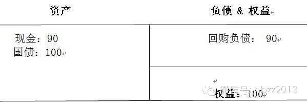 但基金經理買國債的目的並非是被動持有吃利息,那是大媽大嬸幹的事,他買國債是為了進一步融資擴大資產規模來賺錢。於是,他將100元國債在回購市場中進行抵押融資,結果拿回了90元現金(僅為簡單的概念說明),增加了回購交易的資產負債表開始發生了有意思的變化: