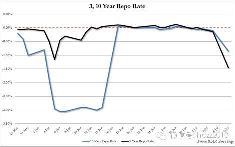 2013年5月開始,美國3年和10年國債回購利率逆轉為負值