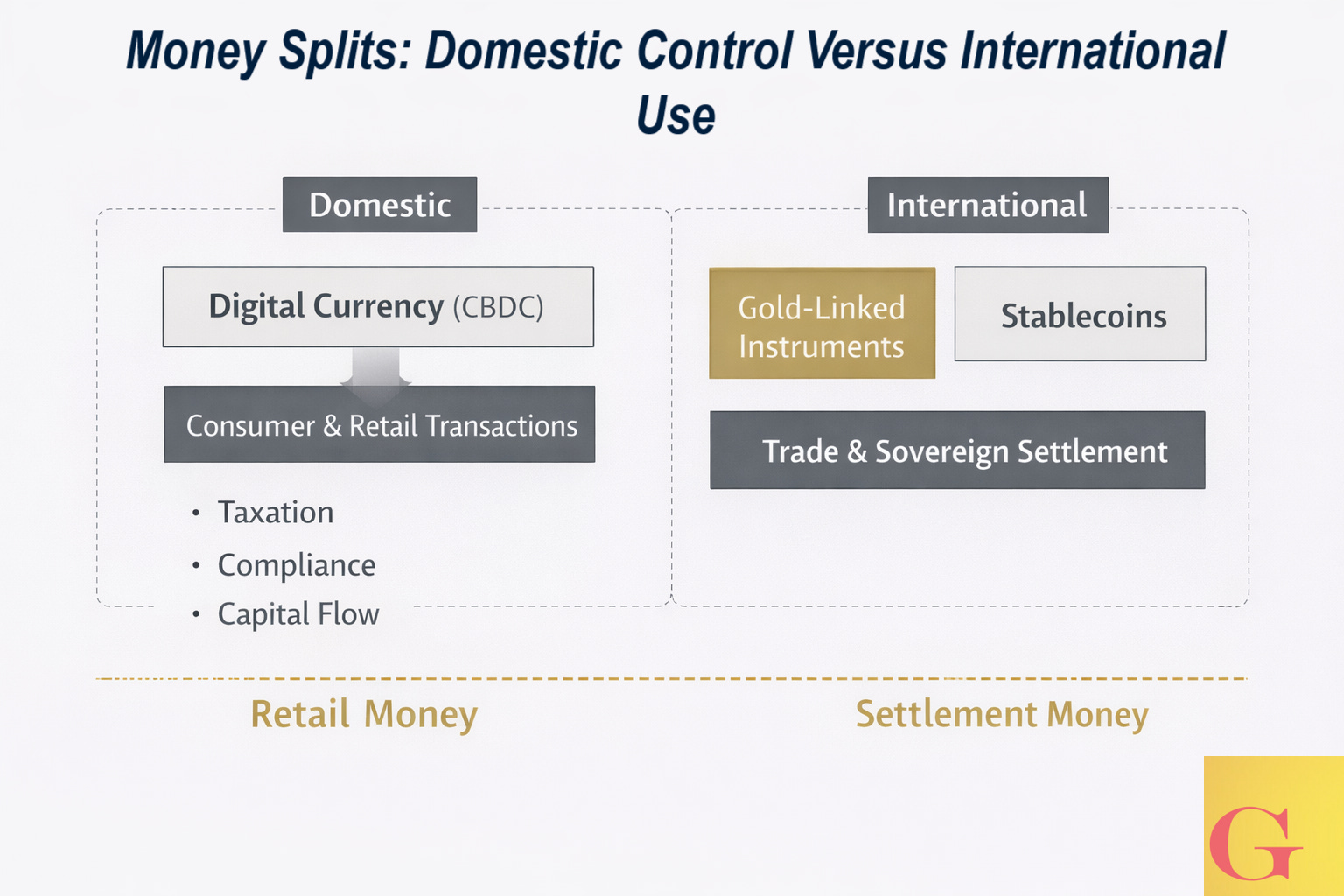 In parts of the East, this may involve CBDCs paired with gold-linked settlement mechanisms. In the West, it may involve stablecoins layered atop existing financial infrastructure.